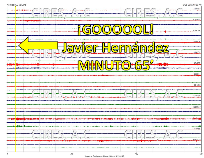 Esta situación llevó a que algunos especialistas del Instituto de Ingeniería de la UNAM solicitaran a CIRES que grabase en tiempo real con algunos instrumentos que disponemos en el Valle de México durante el encuentro de futbol de Corea de Sur vs. México del sábado 23 de Junio de 2018. Se pidió que cuando la selección de futbol de México anotase un gol, se observaran los registros de aceleración que disponemos en tiempo real.