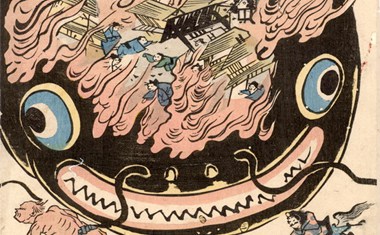 “Este dibujo representa un namazu como sacerdote sentado dentro de un rosario gigante. La criatura no quiere causar ningún más terremotos, pero los “adoradores” – comerciantes como madereros y carpinteros que se benefician de la catástrofe – están orando para que actúe de nuevo. Los fantasmas de las víctimas del terremoto flotan por encima”