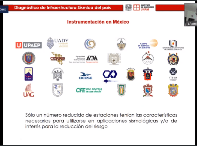 Por otra parte el Dr. Leonardo Ramírez Guzmán del Instituto de Ingeniería de la UNAM explicó sobre la red de monitoreo que maneja el Instituto de Ingeniería orientada hacia la ingeniería sísmica sus aplicaciones y las herramientas que permiten monitorear el riesgo de manera inmediata. Explicó las implicaciones en el riesgo a mediano y largo plazo en las que el monitoreo es importante. Recordó la primera estación acelerográfica en el país desde 1961, mencionó que muchas generaciones de investigadores en el Instituto de Ingeniería que se ha preocupado del monitoreo de movimientos fuertes que son de especial interés para la ingeniería sísmica y el diseño de edificios. Los beneficios a corto plazo del monitoreo sísmico permiten conocer estimaciones rápidas de la severidad del movimiento e inundaciones generadas por tsunami, como daños potenciales a la infraestructura y vivienda. A mediano y largo plazo permiten mejorar la zonificación sísmica y las estimaciones del movimiento del terreno para definir las solicitaciones sísmicas en las estructuras. Esto implica reducción del riesgo asociado al fenómeno. Comento que hay diversas instituciones que se han ocupado en el monitoreo y la instrumentación, entre ellas el CIRES, A.C.