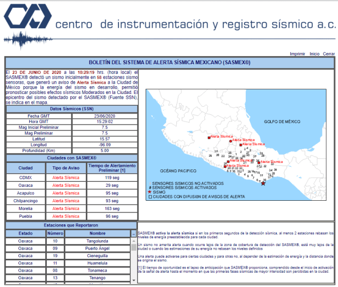 El Sistema de Alerta Sísmica Mexicano SASMEX proporcionó decenas de segundos de tiempo de oportunidad antes del sismo de magnitud 7.5 del 23 de junio a las 10:29 hrs.