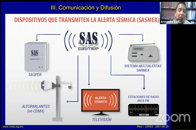 CIRES, AC. Compartió con la comunidad peruana y científicos invitados de otros países sobre sus orígenes. También la historia, cobertura, funcionamiento, difusión, aprovechamiento, desempeño y divulgación de SASMEX como alerta temprana para sismos.