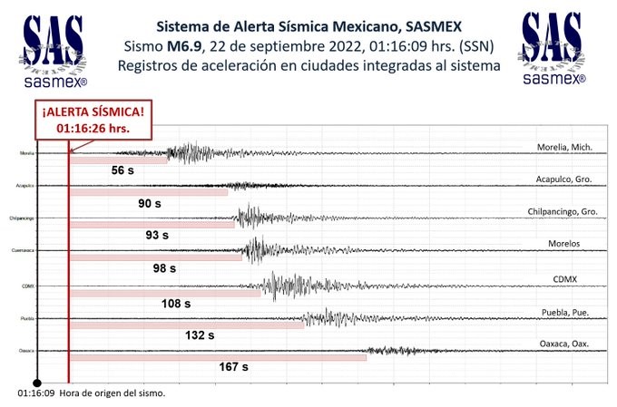 Este jueves 22 de septiembre de 2022, a las 01:16 hrs. (hora local), el Sistema de Alerta Sísmica Mexicano SASMEX alertó a la CDMX con 92 segundos de oportunidad antes de la llegada de las ondas sísmicas de mayor energía, durante el terremoto de magnitud 6.9 a 84 km al sur de Coalcomán, Michoacán, con una profundidad de 12 km (De acuerdo con el Servicio Sismológico Nacional, UNAM). Este sismo acontece en el mismo lugar del epicentro del pasado terremoto del 19S de 2022 ocurrido casi 45 minutos después del simulacro nacional 2022.