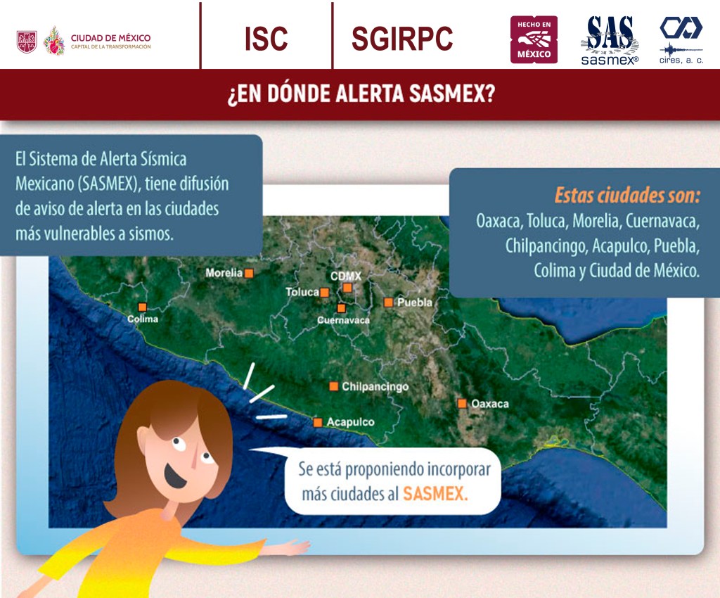 Escucharás el sonido oficial del SASMEX en Radio, Televisión, altavoces de la CDMX y receptores multialertas autorizados por la Secretaria de Gestión Integral de Riesgos y Protección Civil (SGIRPC), en las ciudades en las que está habilitado el aviso: Morelia, Toluca, Cuernavaca, Puebla, Chilpancingo, Acapulco, Oaxaca, Colima y CDMX.