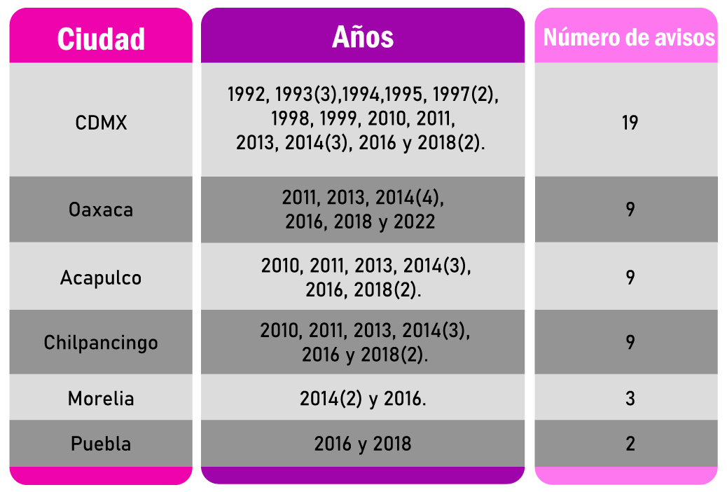 Las ciudades que recibieron aviso de alerta en el mes fueron CDMX, Oaxaca, Acapulco, Chilpancingo, Morelia y Puebla.