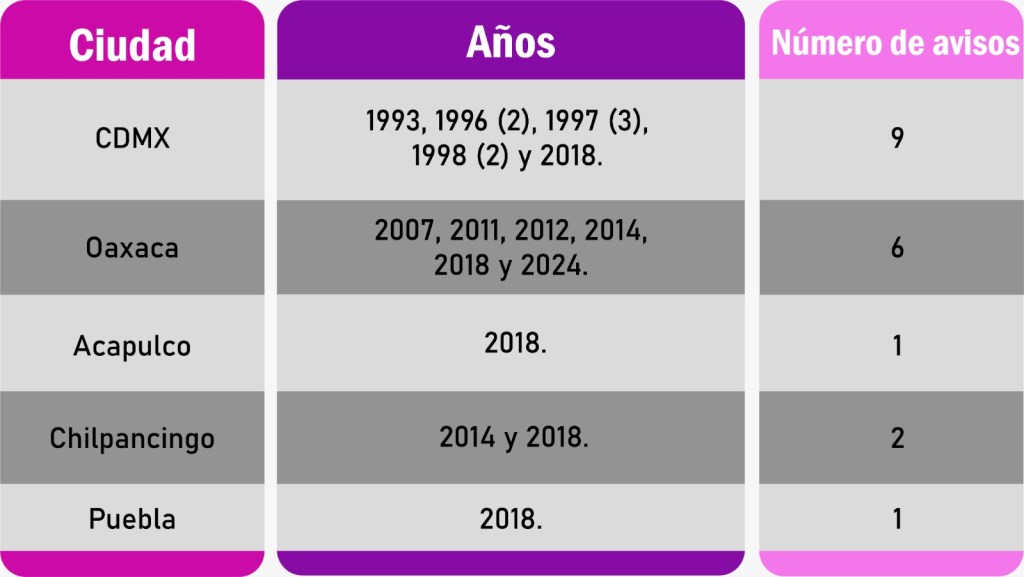 Las ciudades que recibieron aviso de alerta en el mes fueron CDMX, Oaxaca, Acapulco, Chilpancingo, Morelia y Puebla.
