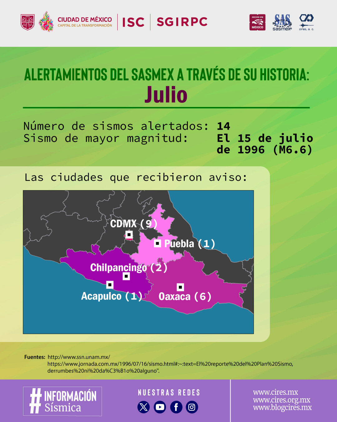 El sismo de mayor magnitud alertado por el SASMEX en el mes de julio, fue el del día 15 de julio de 1996, M6.6 a las 16:23 hrs. Fue ubicado por el Servicio Sismológico Nacional a 17 km al este de Petatlán, Guerrero.