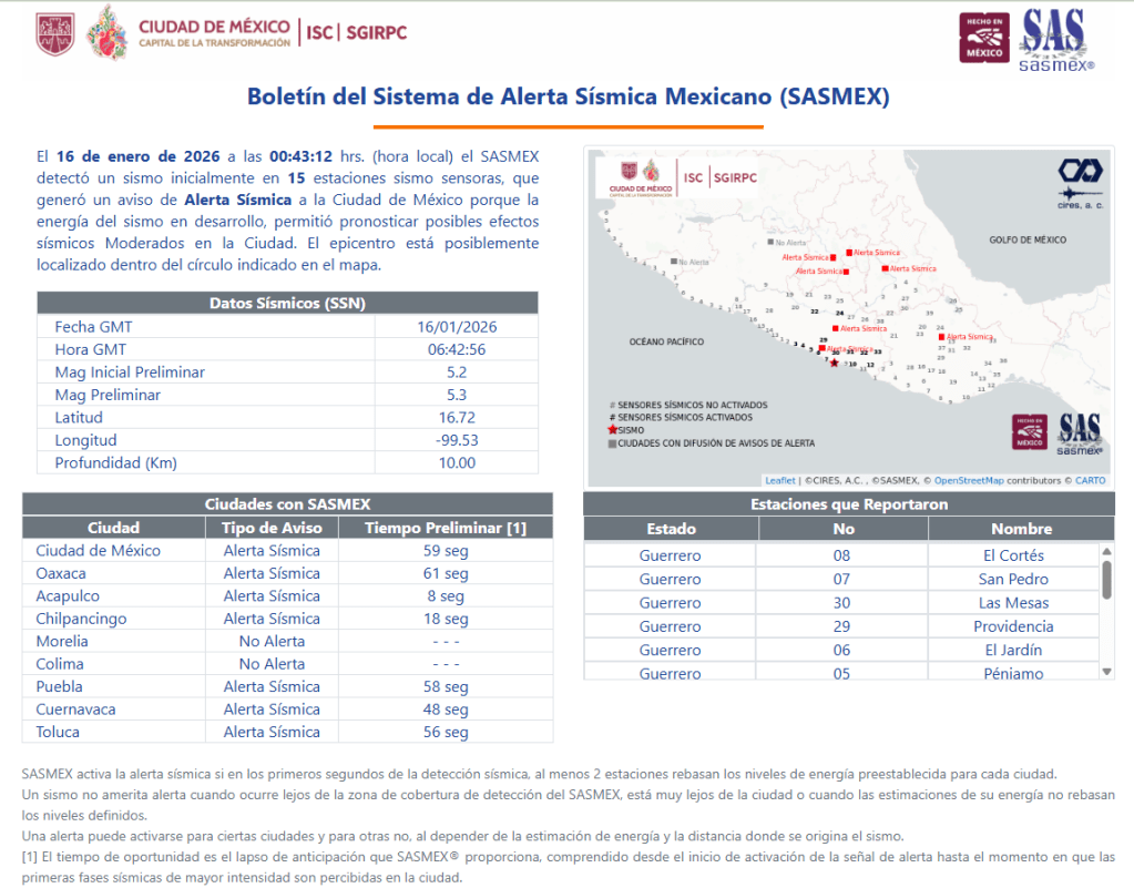 Este jueves 16 de enero de 2026, a las 00:43 hrs. (hora local), el Sistema de Alerta Sísmica Mexicano (SASMEX) alertó a la CDMX con 59 segundos de oportunidad antes de la llegada de las ondas sísmicas de mayor energía, durante el terremoto de magnitud 5 a 17 km al suroeste de San Marcos, Guerrero, con una profundidad de 5 km (Servicio Sismológico Nacional (SSN), UNAM).