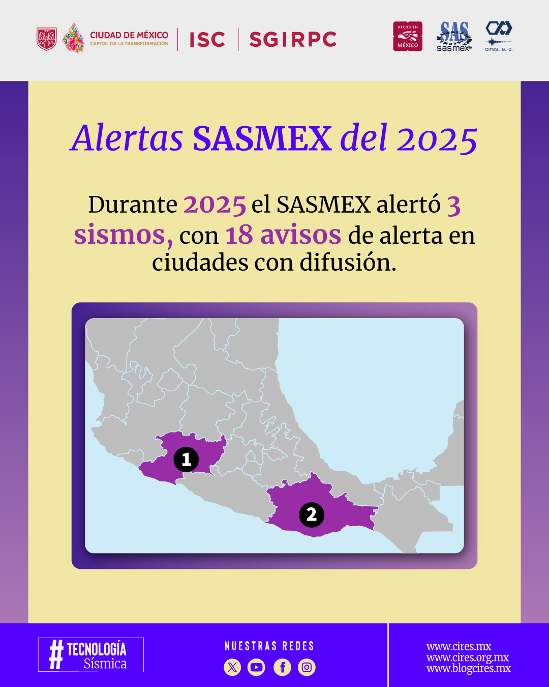 - SASMEX alertó 3 sismos que fueron registrados por los 96 sensores de SASMEX durante 2025; lo que correspondió a un total de 18 avisos de alerta en las ciudades con difusión.