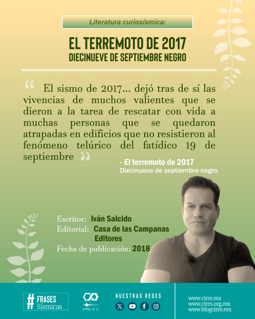 En esta entrega te platicamos acerca del libro: El terremoto de 2017. Diecinueve de septiembre negro. Esta obra forma parte de la trilogía de los principales sismos que han afectado a la Ciudad de México: El día que el ángel voló (1957) y Crónica del desastre en México (1985) del arquitecto, autor y cronista Iván Salcido.