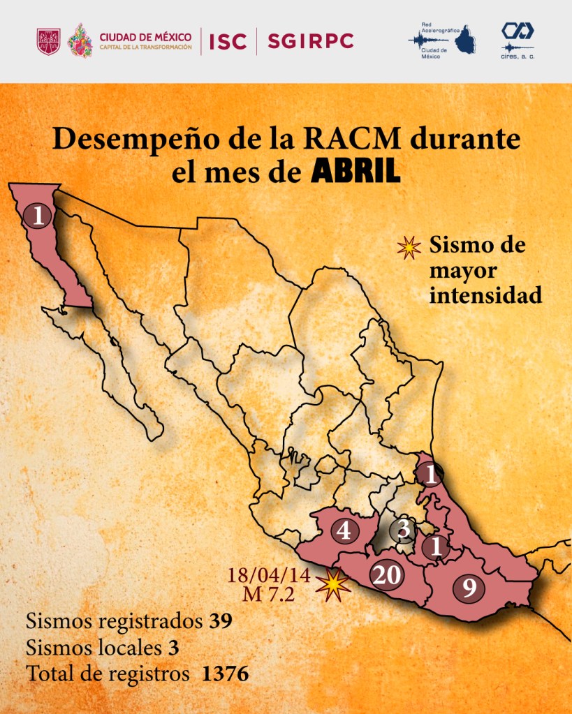 A lo largo de la historia de la Red Acelerográfica de la Ciudad de México (RACM), hasta febrero del 2026, se han registrado un total de 382 sismos, de los cuales 39 ocurrieron en el mes de abril; entre ellos, 13 fueron alertados por el Sistema de Alerta Sísmica Mexicano (SASMEX).
