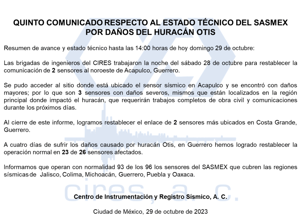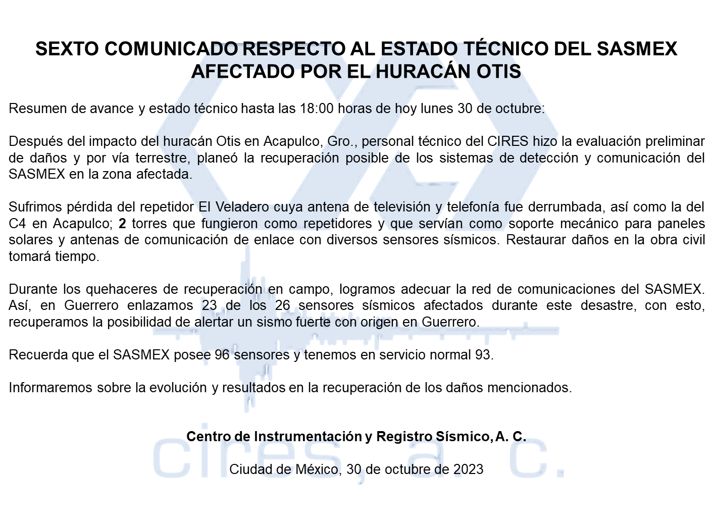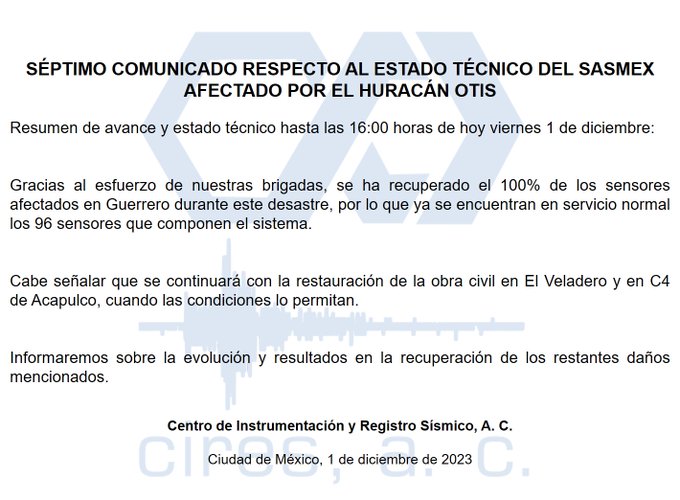 Séptimo comunicado del estado actual del SASMEX por daños del huracán Otis Comparte esto: Haz clic para compartir en X (Se abre en una ventana nueva) X Haz clic para compartir en Facebook (Se abre en una ventana nueva) Facebook Haz clic para compartir en Pinterest (Se abre en una ventana nueva) Pinterest Haz clic para compartir en Telegram (Se abre en una ventana nueva) Telegram Haz clic para compartir en WhatsApp (Se abre en una ventana nueva) WhatsApp Me gusta Cargando...