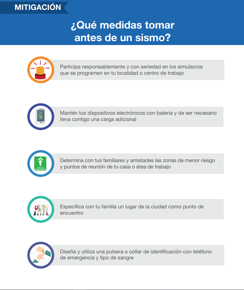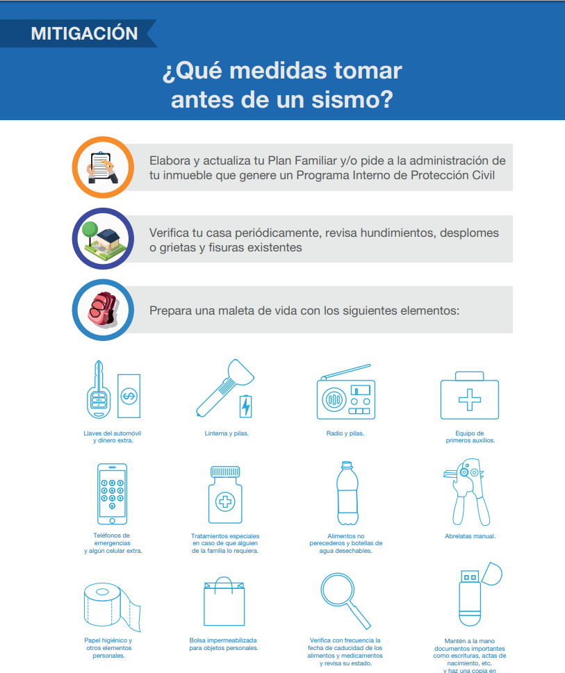 Te presentamos la información que ha publicado la Secretaria de Gestión Integral de Riesgos y Protección Civil sobre las acciones a realizar para estar preparados antes de la ocurrencia de un sismo.