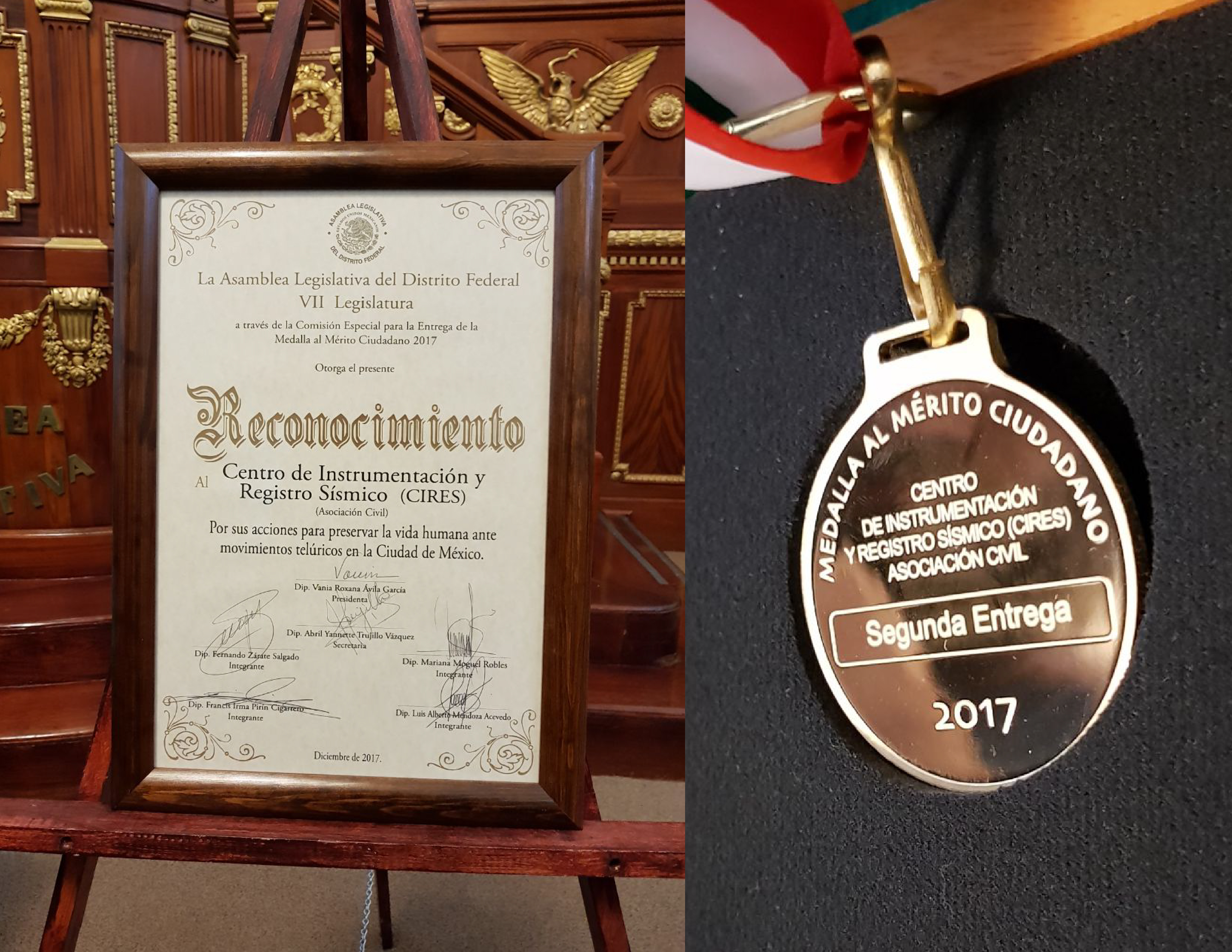 Este año, el Centro de Instrumentación y Registro Sísmico CIRES, A.C., asociación civil no lucrativa fundada en junio de 1986, originalmente bajo el auspicio de la Fundación Javier Barros Sierra, A. C., para promover la investigación y desarrollo de tecnología aplicada a la instrumentación sísmica; es galardonada con la Medalla al Mérito Ciudadano 2017 por su contribución en la mitigación del riesgo sísmico emitiendo avisos de alerta sísmica a la Ciudad de México y a los estados de Jalisco, Colima, Michoacán, Guerrero, Oaxaca y Puebla mediante el Sistema de Alerta Sísmica Mexicano SASMEX.