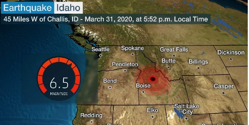 Un terremoto de magnitud 6.5 ocurrió el día de ayer 31 de marzo de 2020 a las 23:52:31 hrs. (UTC) en Idaho, Estados Unidos a unos 72 kilómetros al oeste de Challis. Según los informes, el terremoto también se sintió en el este de Washington se está registrando como el más significativo del estado en casi 40 años.