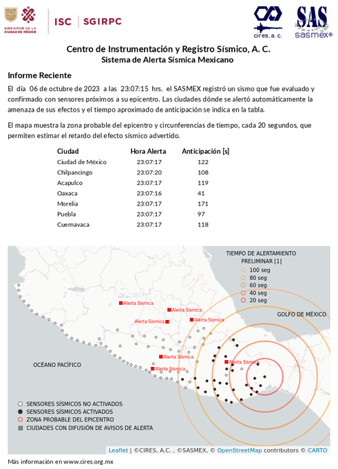 El SASMEX) es un sistema de alerta temprana para terremotos, que avisa a la población con decenas de segundos de anticipación sobre la llegada de un sismo fuerte que podría afectarla. Proporcionando así, tiempo de oportunidad para realizar acciones que protejan la vida y reducir la pérdida de bienes materiales.