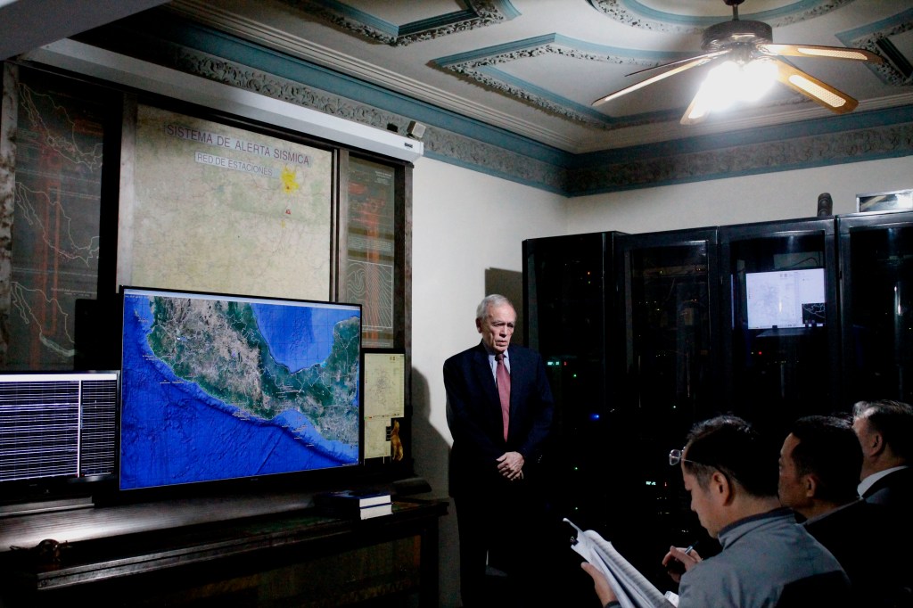 El Ing. Juan Manuel Espinosa Aranda, director general de CIRES, A. C. compartió con la delegación China cómo ha sido la evolución del SASMEX a más de 30 años de operación. Destacó la condición geográfica respecto a la distancia entre la Ciudad de México y la región sísmica más peligrosa del país ubicada a lo largo de la costa del océano Pacífico; lo que determina que SASMEX proporcione un tiempo de anticipación que varía de 20 a 120 segundos.