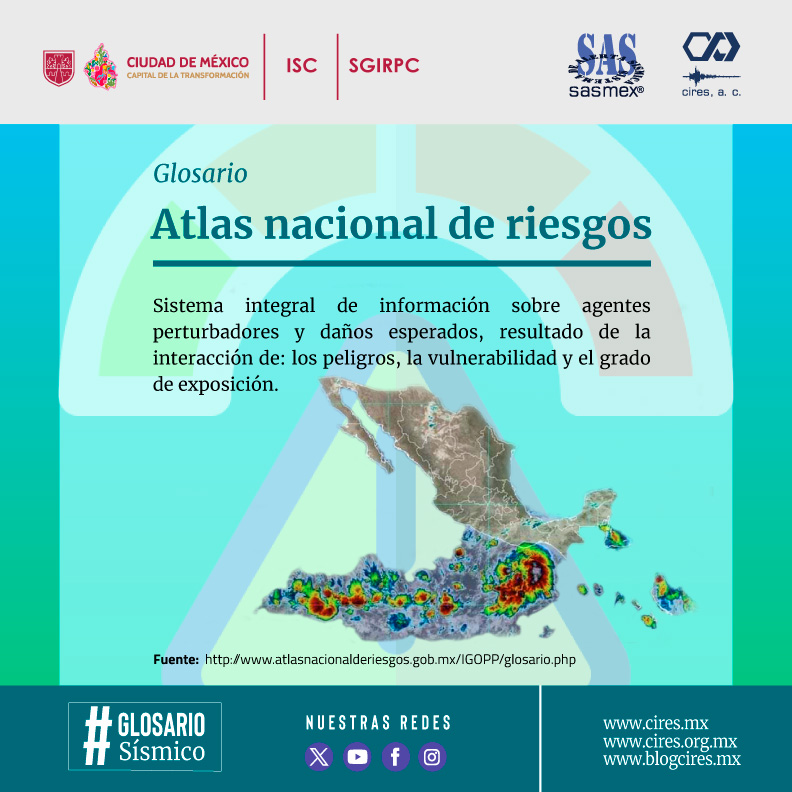 La Ley General de Protección Civil define el Atlas Nacional de Riesgos como una herramienta de información con bases de datos que permiten analizar la interacción entre el peligro, la vulnerabilidad y el riesgo de desastres.