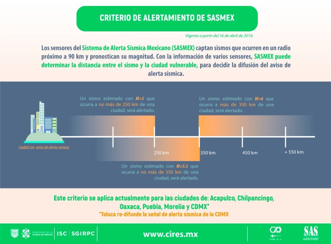 El Sistema de Alerta Sísmica Mexicano SASMEX® difunde en las ciudades de Toluca, Puebla, Acapulco, Chilpancingo, Oaxaca, Morelia y Ciudad de México.