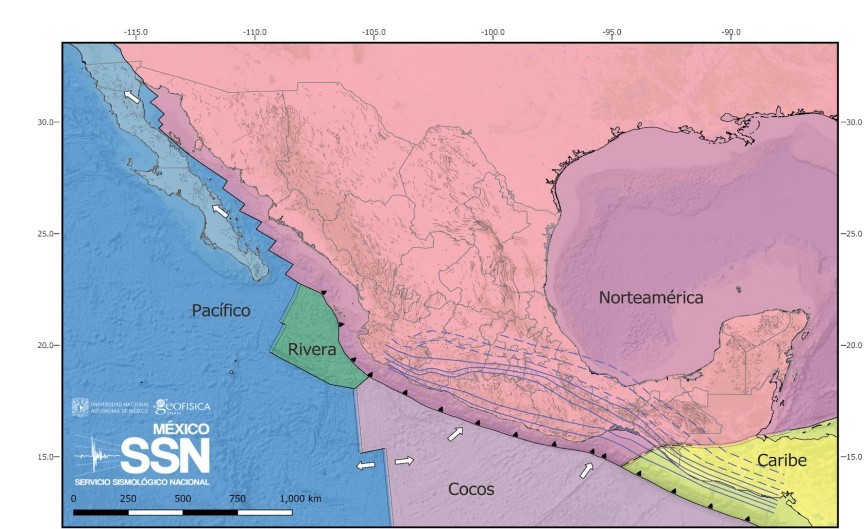 “La placa de Rivera se sumerge bajo Jalisco y Colima, mientras que Cocos lo hace debajo de Michoacán, Guerrero, Oaxaca y Chiapas. Al sur de Chiapas y en Centroamérica, Cocos continua, pero ahora sumergiéndose debajo de la placa del Caribe”. [1]