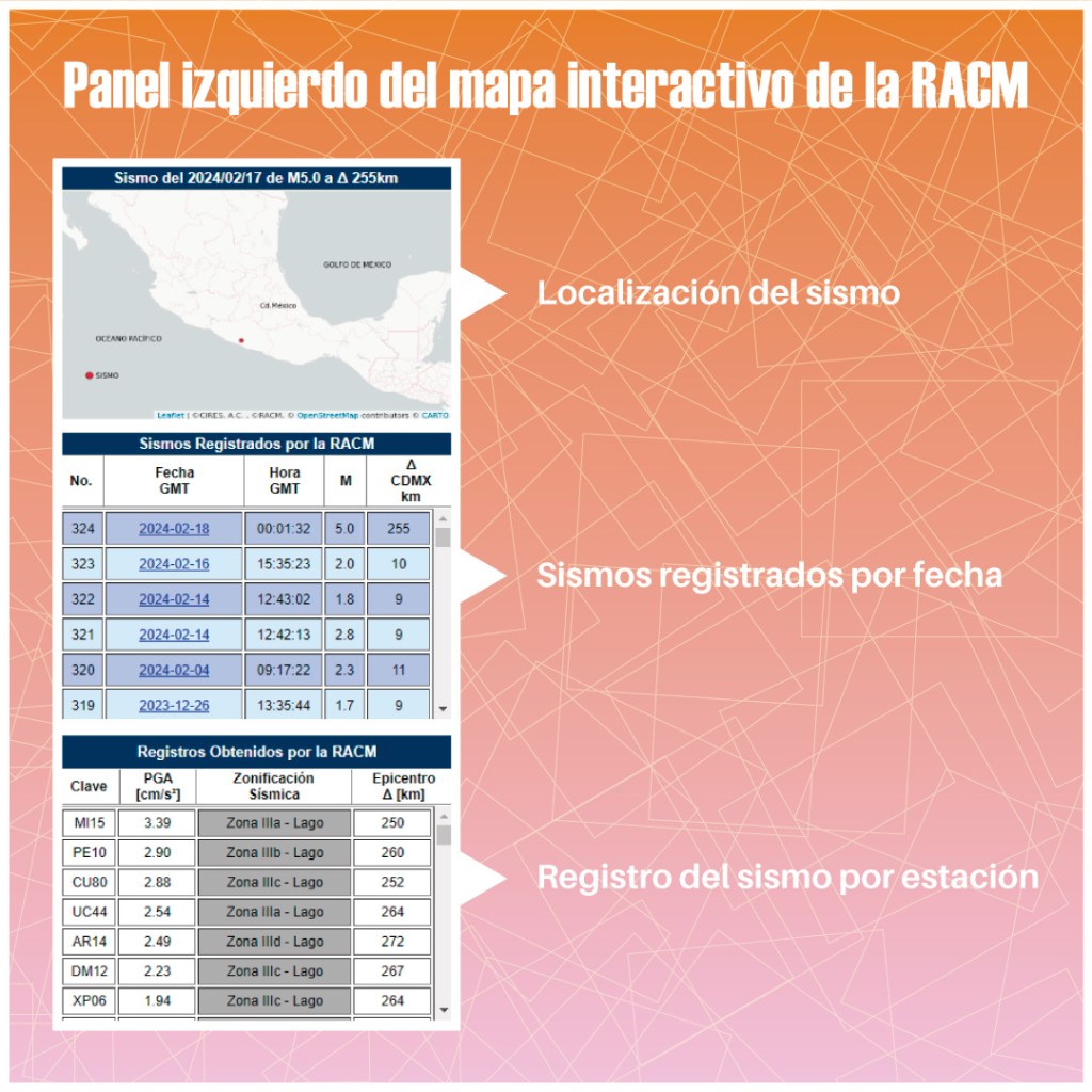 En esta publicación, te mostraremos la descripción del panel izquierdo, que se encuentra dividido en tres secciones: la primera muestra el mapa de nuestro país con la ubicación del sismo, con un punto en color rojo, que indica el lugar del sismo. En la segunda sección, es la lista de sismos registrados por la RACM desde 1987 al año en curso, con los datos de: fecha GMT, Hora GMT, Magnitud y distancia a la CDMX. En la tercera sección, se muestran los registros obtenidos por cada estación; el efecto sísmico elegido, la zonificación sísmica y la distancia de la CDMX al epicentro. La información correspondiente a lo seleccionado, se mostrará en los paneles restantes.
