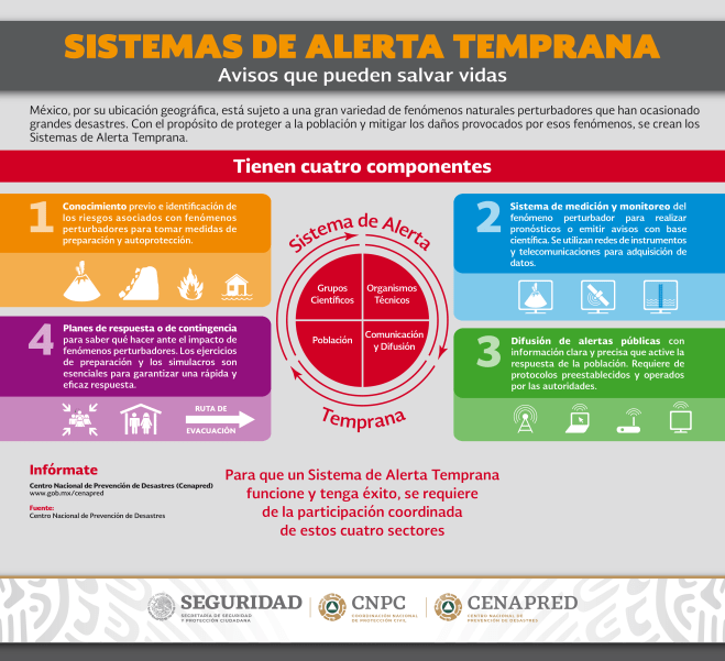 Te invitamos a conocer los elementos que conforman un sistema de Alerta Temprana efectivo en esta infografía proporcionada por la Secretaría de Seguridad y Protección Ciudadana.