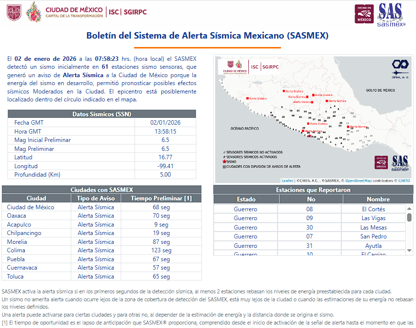 Este viernes 2 de enero de 2026, a las 07:58:23 hrs. (hora local), el Sistema de Alerta Sísmica Mexicano (SASMEX) alertó a la CDMX con 68 segundos de oportunidad antes de la llegada de las ondas sísmicas de mayor energía, durante el terremoto de magnitud 6.5 a 4 km al suroeste de San Marcos, Guerrero, con una profundidad de 5 km (Servicio Sismológico Nacional (SSN), UNAM).