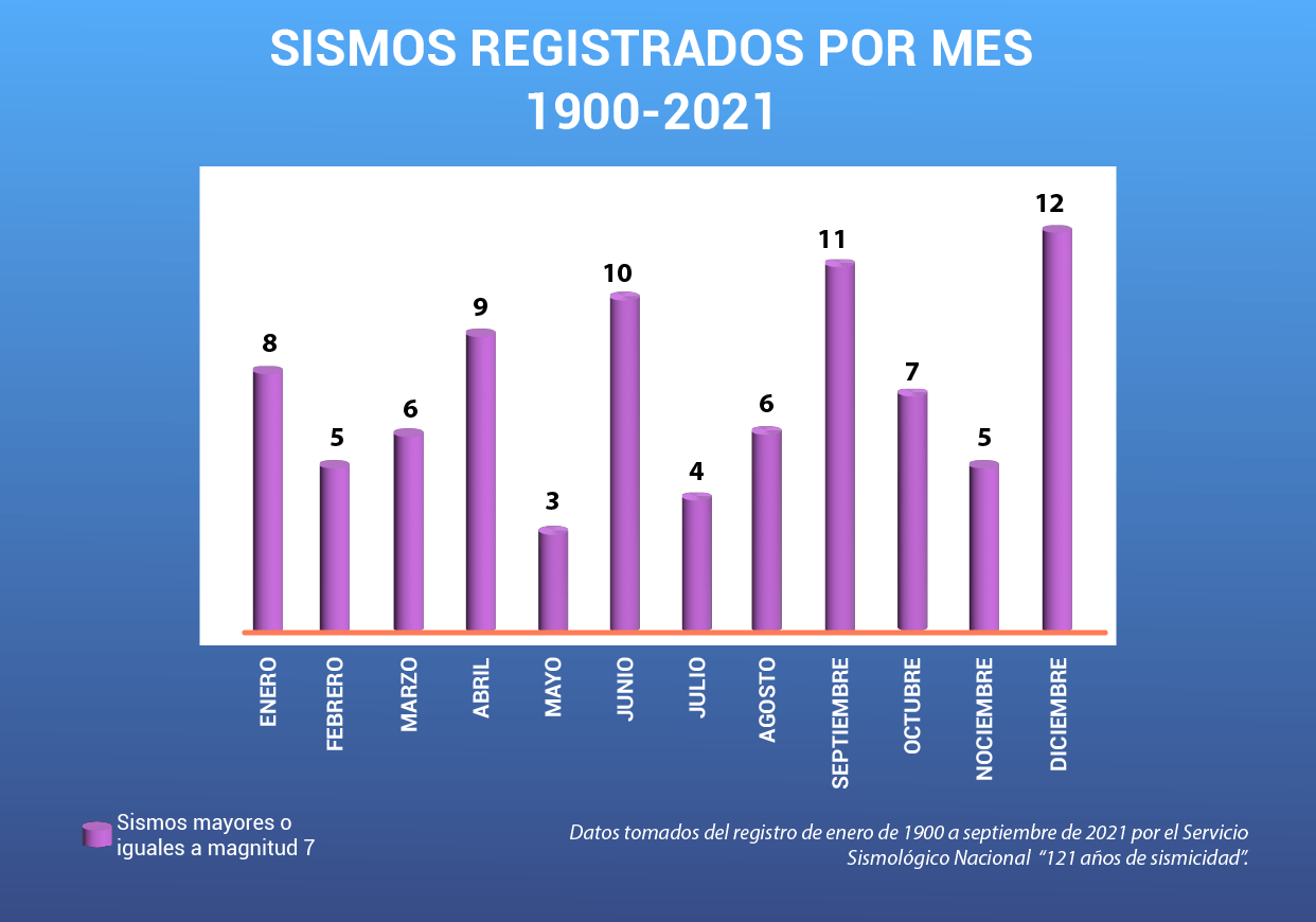 Así, respecto a los sismos registrados por el SSN mayores o iguales a 7, podemos observar que el mes que menor número de sismos tuvo en estos 121 años es el mes de mayo, y el mes que más sismos experimentó con esta magnitud fue diciembre.