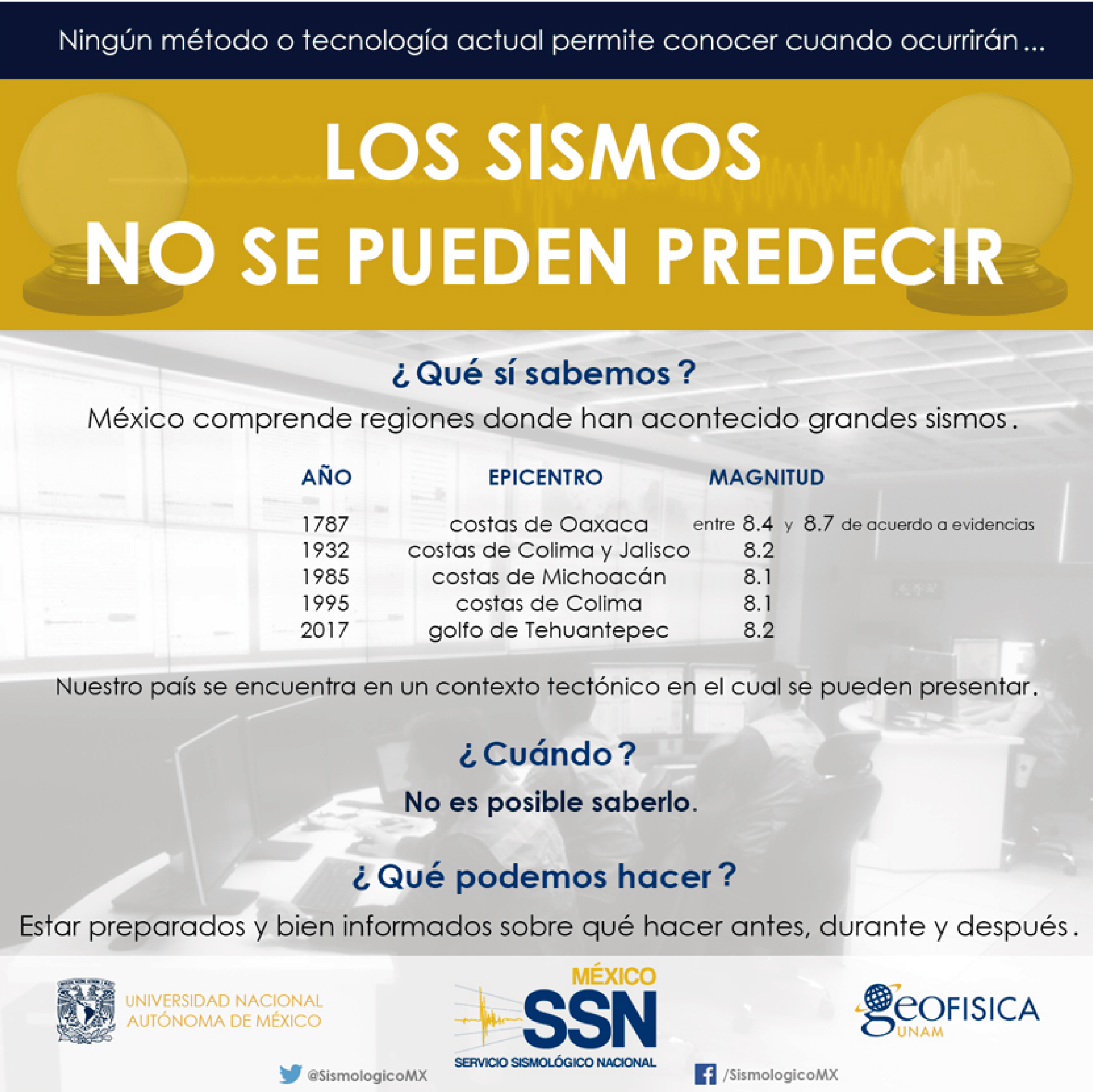 De acuerdo al Servicio Sismológico Nacional (SSN): «Hasta hoy, no existe una técnica que permita predecir los sismos. Ni los países como Estados Unidos y Japón cuya tecnología es muy avanzada, han sido capaces de desarrollar una técnica predictiva de temblores. Dado que vivimos en un país con gran actividad sísmica la única certeza que tenemos es que tiembla constantemente y que debemos estar preparados. Ante cualquier evento sísmico lo único que nos puede ayudar es la prevención».